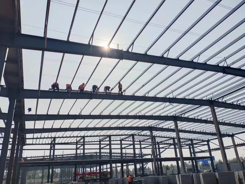Portalstålstrukturkomponenterna lossas och monteras enligt byggplanen.