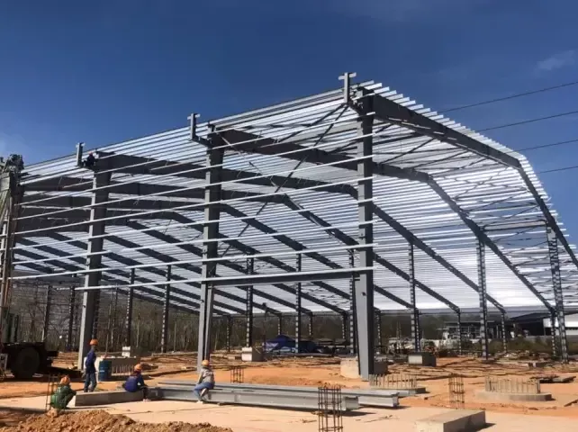 De prefabricerade stålkomponenterna transporteras till byggplatsen och monteras med kranar och annan tung utrustning. Installationsprocessen börjar vanligtvis med att upprätta och förankra kolumnerna till grunden. Strålar installeras sedan för att ansluta kolumnerna och bildar ramen för lagret. Takstolar uppförs och säkras till ramen, vilket stödjer taksystemet. Denna metodiska monteringsprocess säkerställer byggnadens strukturella integritet och stabilitet.