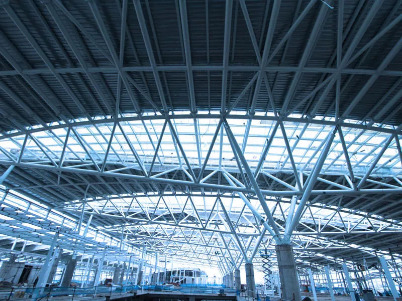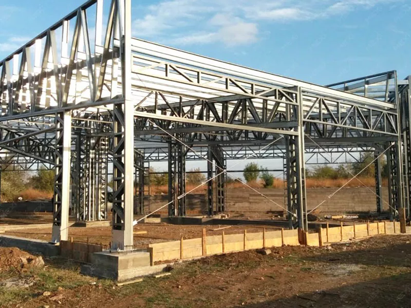 4. Installation av stålkonstruktion De prefabricerade stålkomponenterna transporteras till byggplatsen och monteras med hjälp av kranar och annan tung utrustning. Installationsprocessen börjar med att pelarna monteras och förankras i fundamentet, följt av montering av balkar för att bilda lagerramen. Takstolar säkras sedan för att stödja taksystemet.