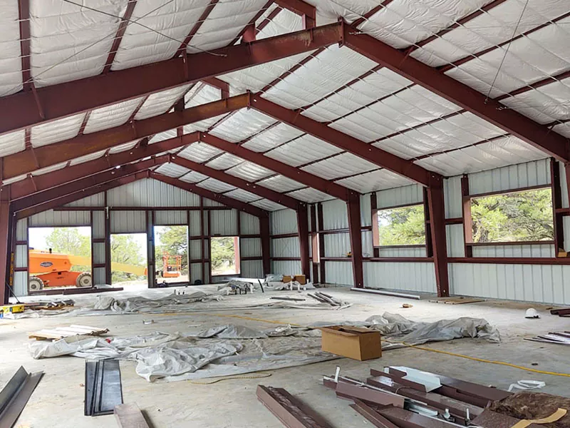 Tak och yttre beklädnad:När stålramen är klar installeras taksystemet, vanligtvis bestående av isolerade metallpaneler eller enskiktsmembranmaterial. Ytterväggar, om de ingår i designen, installeras också med material som metallpaneler eller tegel.